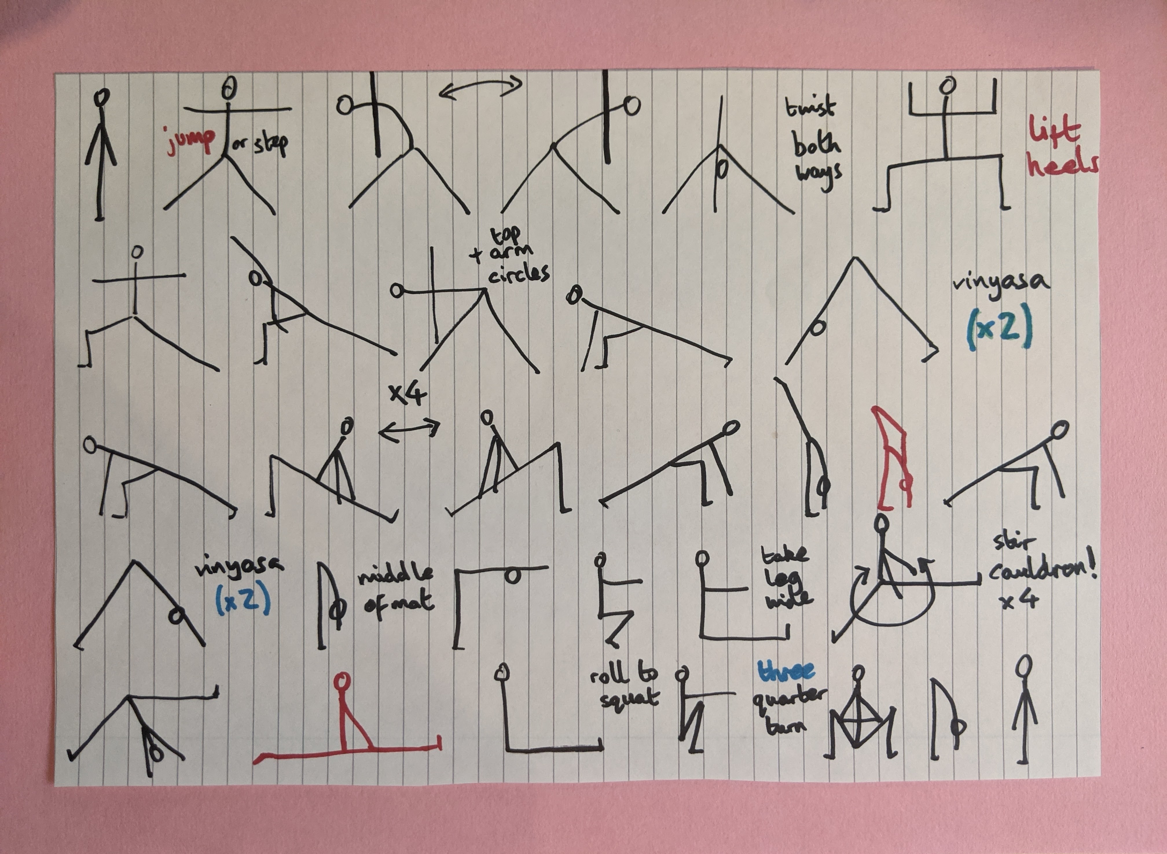 Usually we manage three full rounds in about 45 mins. The written options in blue are a bit of extra strength work, the stuff in red are trickier poses/modifications to deepen the practice. If you want to give Flow a go at a live class, details for how to join are on the home page.