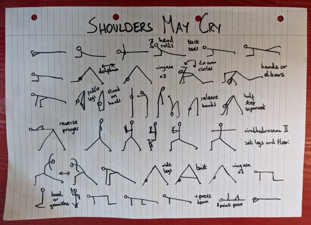 Flow for May 2021 Posted bytravisrothSeptember 13, 2021Posted inUncategorized Here’s May 2021’s Flow in stick figure form. If you’d like a video to practice along with, I recorded myself teaching it and uploaded it to YouTube. We usually aim for 3 rounds of this sequence in around 45 minutes, see how you get on! Share this: Click to share on X (Opens in new window) X Click to share on Facebook (Opens in new window) Facebook Like Loading... Published by travisroth Yoga Teacher/Roller Skater View more posts